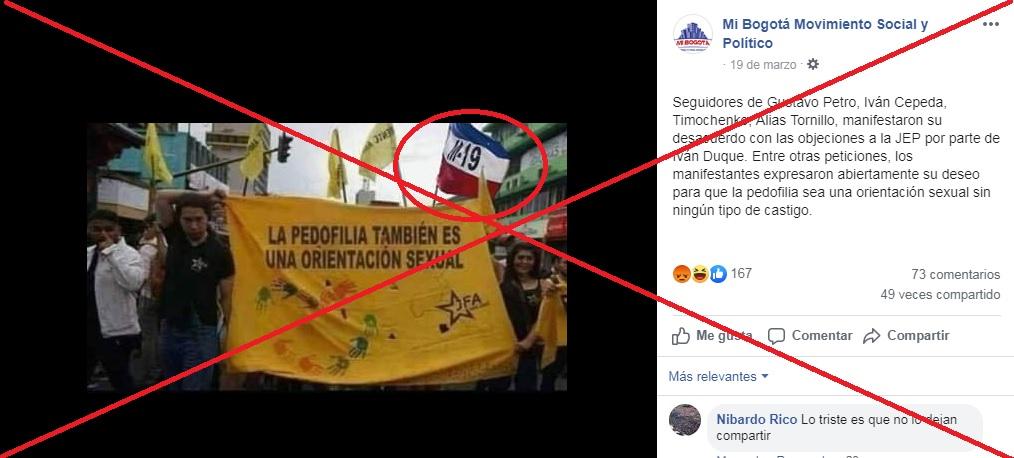 La imagen manipulada también fue utilizada en marzo de 2019 en Colombia, luego de una manifestación en apoyo a la Jurisdicción Especial de Paz (JEP), el mecanismo para investigar a los integrantes de las FARC acusados de participar en el conflicto armado. En esa ocasión se indicaba que los manifestantes también se expresaban a favor de la pedofilia.