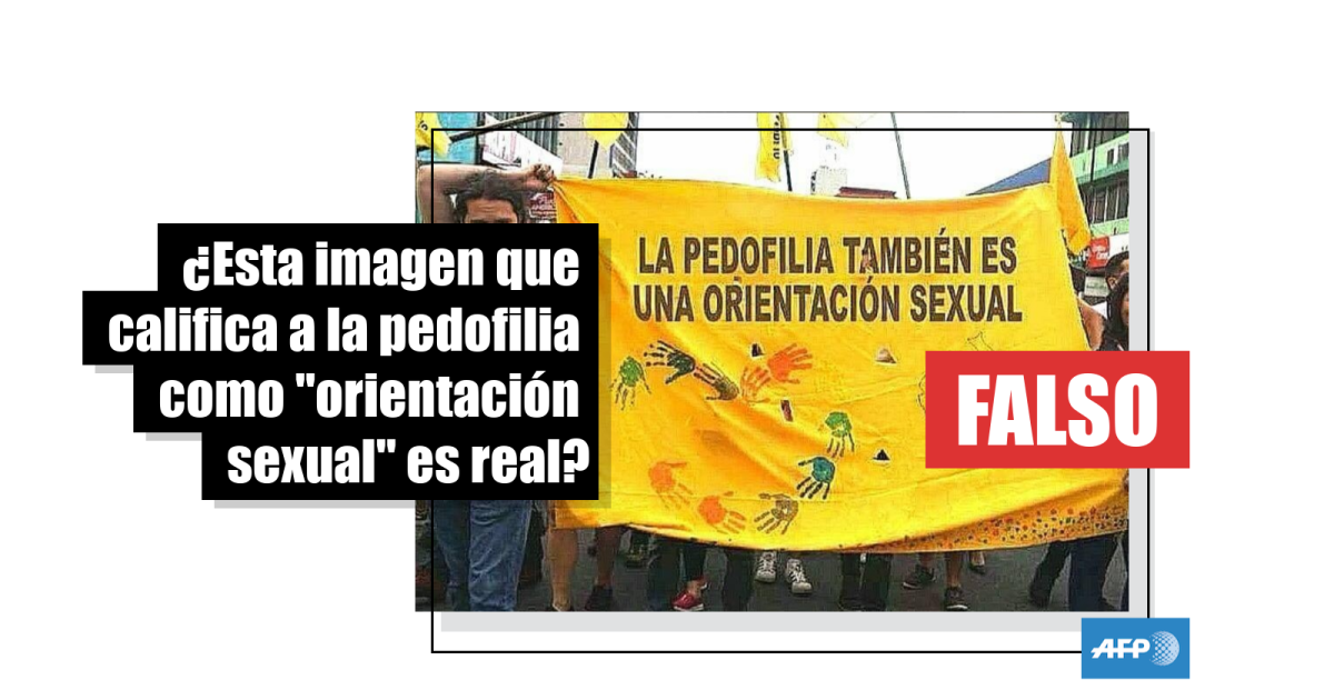 “La pedofilia también es una orientación sexual”, señala una supuesta bandera que portan dos personas durante una manifestación. Sobre la tela de color amarillo se observan un corazón hecho con manos pintadas, una estrella con el texto “JFA San José” y lo que parece ser un mapa.