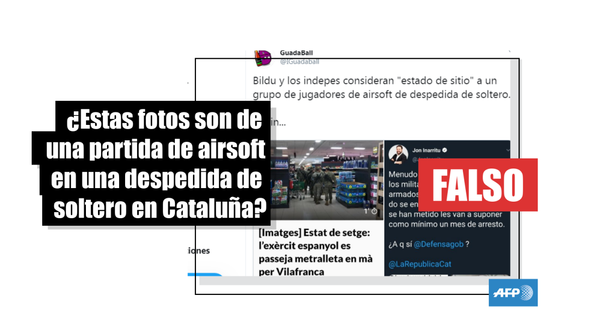 “‘Tropas del ejército español en Cataluña con armas automáticas…’ En realidad: jugadores de Airsoft con réplicas de armas, en una despedida de soltero. 35.000 seguidores, 2.500 RT, sabe que es fake, y ahí sigue el tuit. ¡Y así todo!”, señala un tuit compartido más de 3.000 veces desde el 28 de septiembre. El mensaje responde a otro, en inglés, que difunde las fotos de lo que parecen militares con las armas en el suelo tomando cervezas en la terraza de un bar, en la localidad catalana de Vilafranca del Penedés.