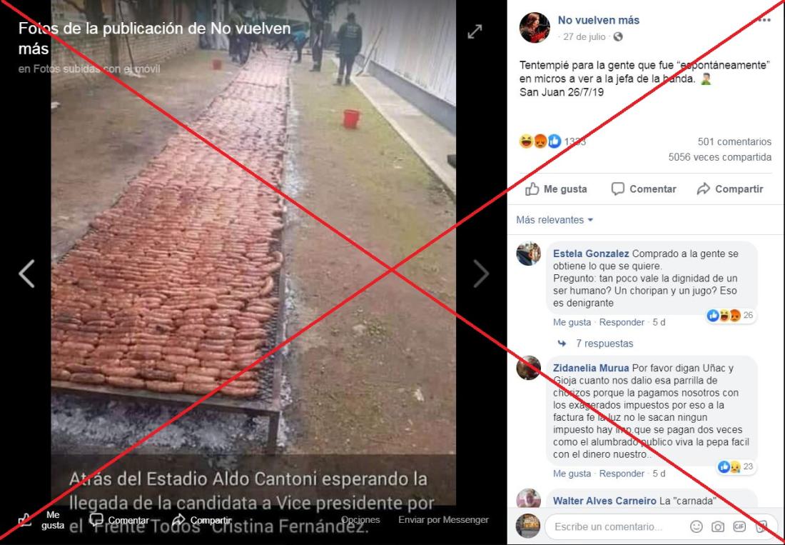 El 26 de julio pasado, la expresidenta Kirchner encabezó un acto en el estadio Aldo Cantoni, en la provincia de San Juan, en el oeste del país. En los más de 500 comentarios de la entrada que se volvió viral, los usuarios expresan su indignación por la supuesta prueba de que quienes asistieron al evento no lo hicieron por convencimiento, sino a cambio de choripanes (chorizos al pan), muy consumidos en Argentina.