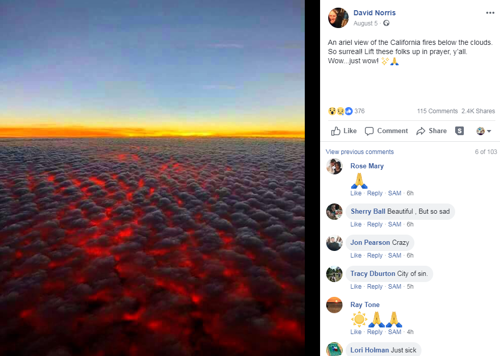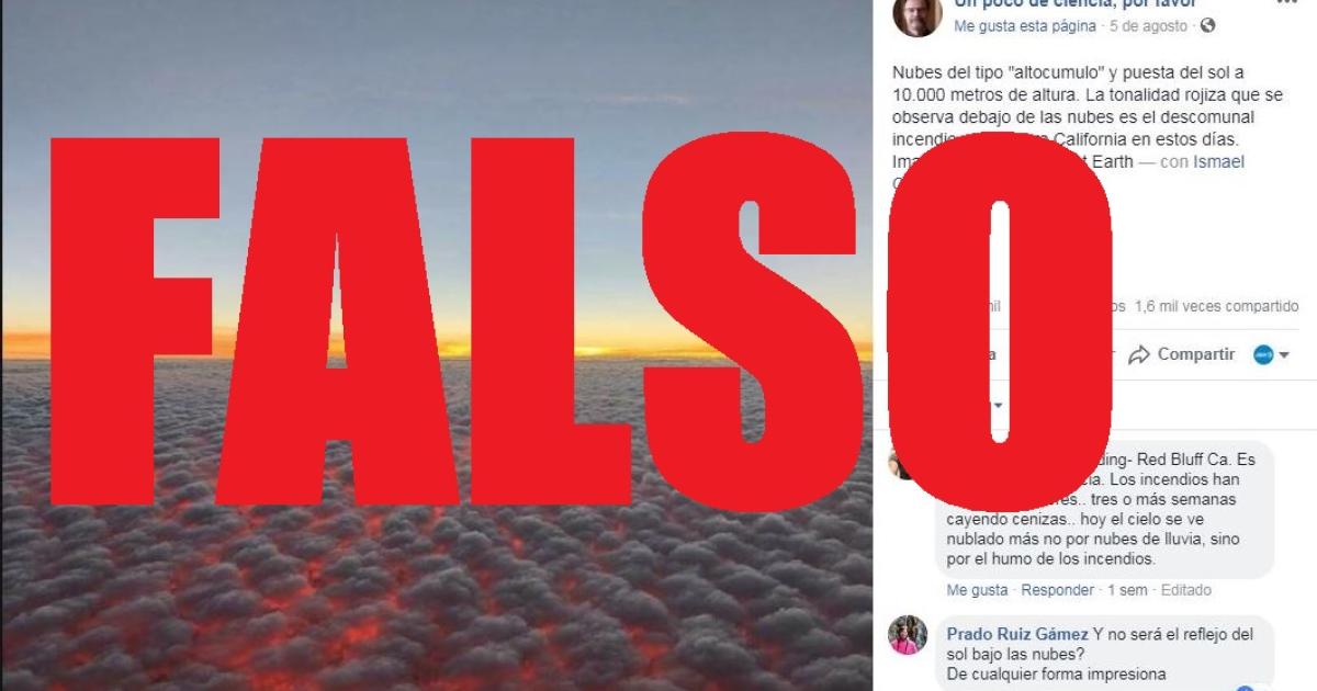 "La tonalidad rojiza que se observa es el descomunal incendio que devora California en estos días", describe un usuario al publicar la imagen; "La primera foto, desde un avión, muestra los incendios iluminando las nubes", dice otro al publicar varias fotos de lo que presenta como los incendios que arrasan California desde hace semanas: la foto que nos interesa, en la que se ven nubes con tonalidades rojizas, fue muy compartida en las redes desde el 4 de agosto.