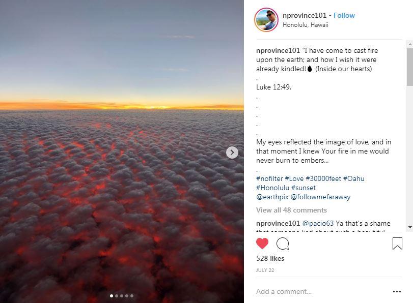 "No la tomé para nada en California. Fue sacada encima del archipiélago de Hawái el 22 de julio (...) Es la foto de una puesta de sol que tomé alrededor de las 19h30-20h desde un avión que volaba hacia la isla de Oahu", explicó Nathan Province, que vive en Hawái.