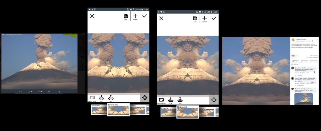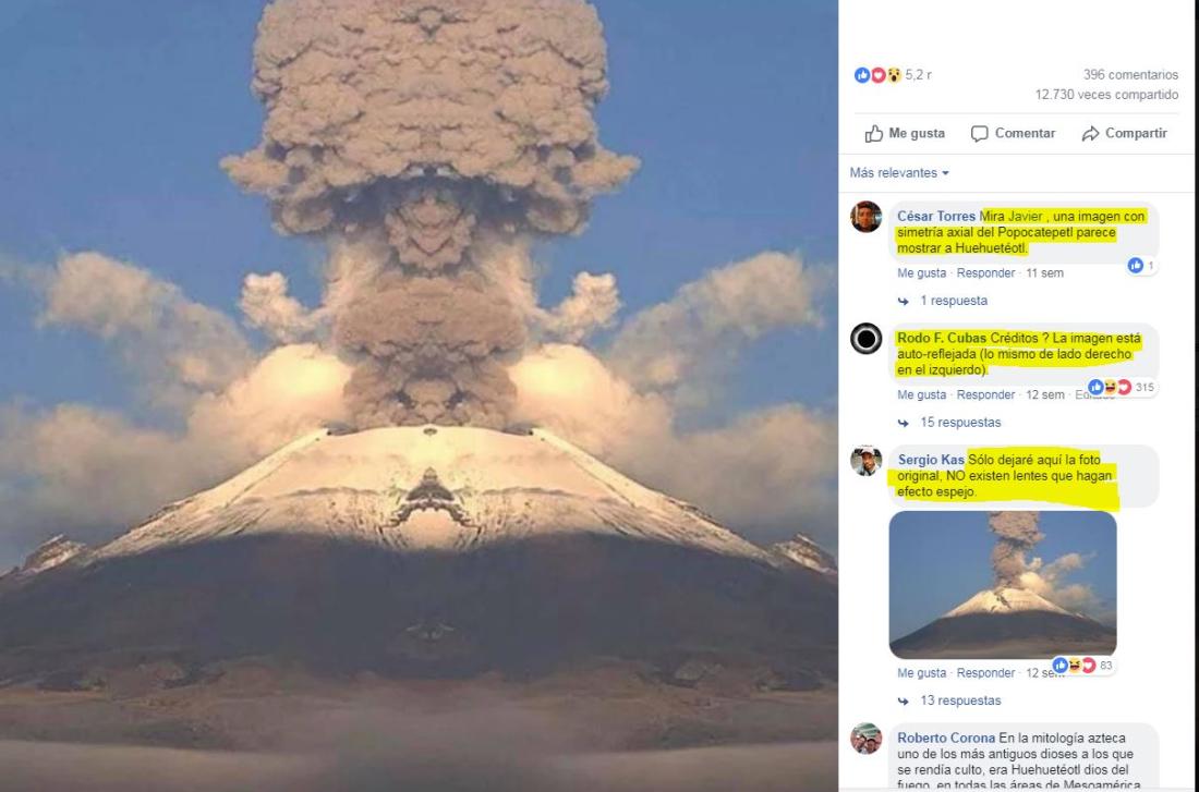 En resumen, la fotografía del Popocatépetl no fue tomada con "un lente especial" sino que fue alterada para lograr un reflejo o efecto espejo. Así, es falso que la figura del dios del fuego Huehueteotl haya emergido del cráter del volcán.
