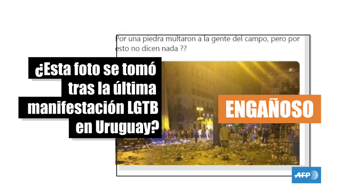 ”Por una piedra multaron a la gente del campo, pero por esto no dicen nada”, señala un tuit publicado el 28 de septiembre que supuestamente muestra un tramo de la avenida 18 de julio, la principal de Montevideo, capital de Uruguay, luego de la Marcha por la Diversidad convocada por los colectivos LGTB de ese país el 27 de septiembre de 2019. Sin embargo, la afirmación es engañosa, la foto no fue tomada en Uruguay ni en 2019.