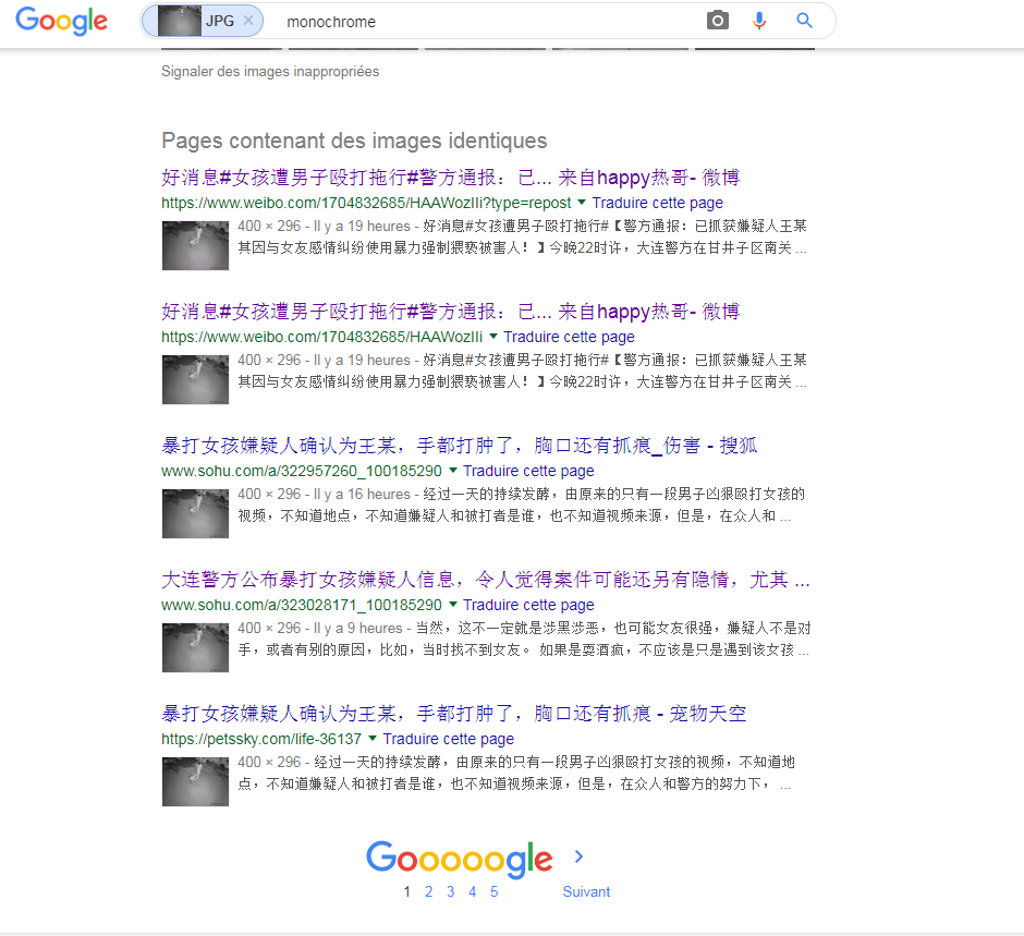 Tras obtener los principales fotogramas de la grabación a través de la herramienta InVid*, el equipo de verificación de la AFP hizo una búsqueda inversa de imágenes a través de Yandex, buscador ruso, y Google Imágenes. Las páginas que contienen imágenes similares están, en su mayoría, en mandarín.