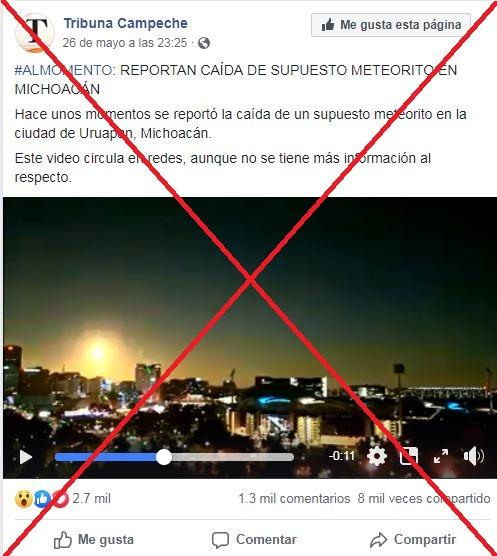 Si bien la noche del 26 de mayo circuló en redes sociales la supuesta noticia del meteorito en Uruapan, Michoacán, las fotos y el video viralizado no corresponden a este fenómeno.