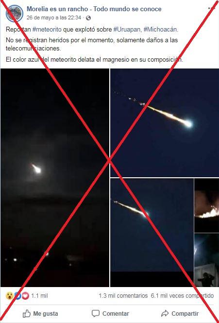 “Reportan #meteorito que explotó sobre #Uruapan, #Michoacán. No se registran heridos por el momento, solamente daños a las telecomunicaciones”, dice el mensaje junto a tres imágenes en una de las publicaciones más compartidas en Facebook desde aquella noche.