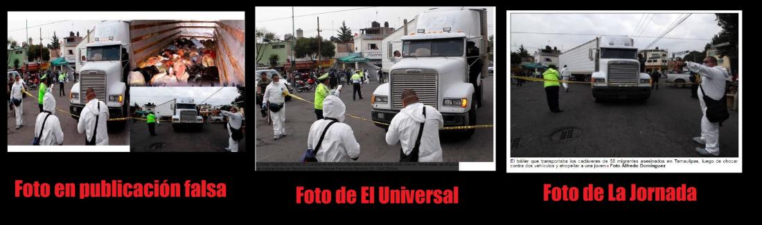 Las fotografías del camión fueron tomadas en México el 1° de septiembre de 2010, cuando un tráiler que transportaba 56 cuerpos de migrantes centro y sudamericanos, asesinados días antes en el estado norteño de Tamaulipas (noreste), chocó contra dos autos particulares, según el periódico mexicano El Universal.