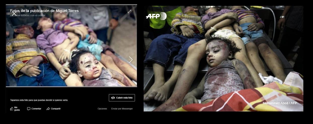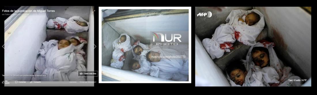 En la última fotografía se ven varios cuerpos de niños envueltos en sábanas blancas dentro un congelador. Esta imagen fue tomada el 3 de agosto de 2014 por un reportero de la agencia Nur Photo después de un ataque militar israelí en la Franja de Gaza, según ya había corroborado el equipo de verificación de la AFP en agosto de 2018.