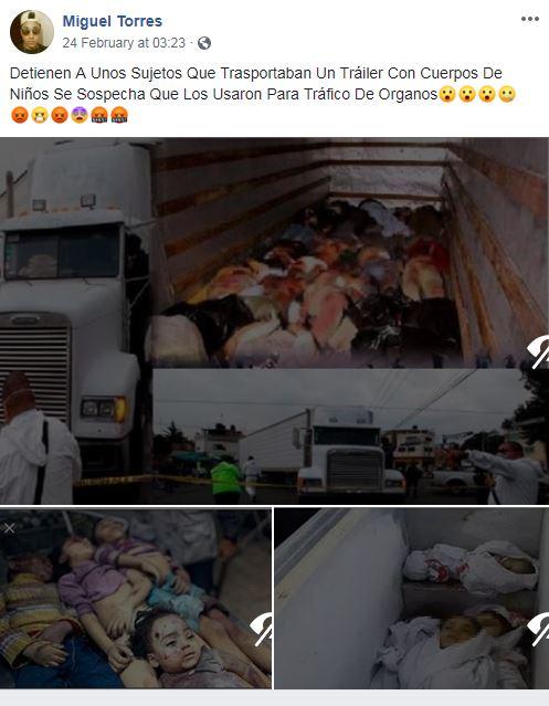 “Detienen A Unos Sujetos Que Transportaban Un Tráiler Con Cuerpos De Niños Se Sospecha Que Los Usaron Para Tráfico De Organos”, dice una publicación del 23 de febrero con cinco imágenes y que hasta el momento se ha compartido más de 138.000 veces.