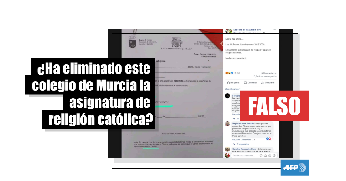 “Los Alcázares (Murcia) curso 2019/2020. Desaparece la asignatura de religión y aparece religión Islámica. Nada más que añadir”, dice una de las publicaciones más compartidas (3.500 veces), en el grupo de Facebook Esposas de la guardia civil. Otras entradas advierten lo mismo (1, 2, 3) en una información sobre Los Alcazares, una localidad costera cercana a Cartagena (sur). La noticia ha sido publicada también en páginas web.