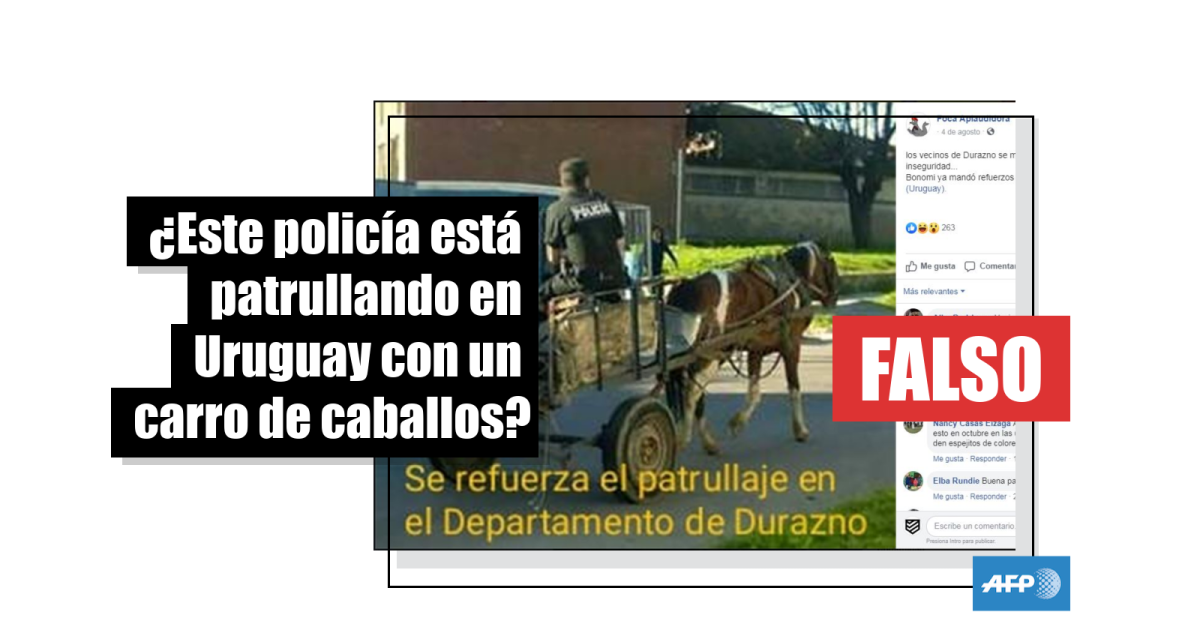 “Se refuerza el patrullaje en el departamento de Durazno [NDLR: En Uruguay]”, dice la leyenda de la publicación compartida cientos de veces en Facebook con la foto de un policía montado en un carro tirado por caballos.
