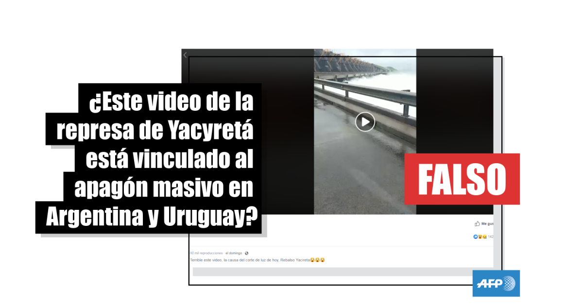 “El video es viejo, volvió a surgir a partir de lo que pasó el domingo [16 de junio]”, explicaron a AFP Factual voceros de EBY, que administra y explota la central hidroeléctrica. “La represa sigue funcionando normalmente. Además, el origen del apagón no tiene nada que ver con Yacyretá, el problema estuvo en el colapso del transporte de energía y nosotros estamos en la etapa de generación”, aseguraron.