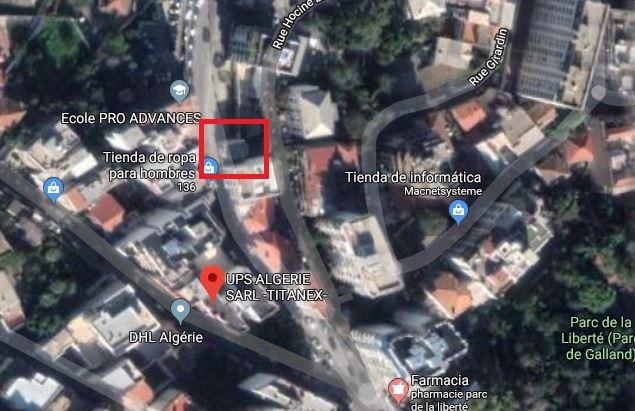 Observando las imágenes, vemos una plazoleta limitada por una pared y una construcción baja. Al recorrer esta calle de Argel en Google Maps, con una vista satelital, hallamos un lugar que parece corresponder.