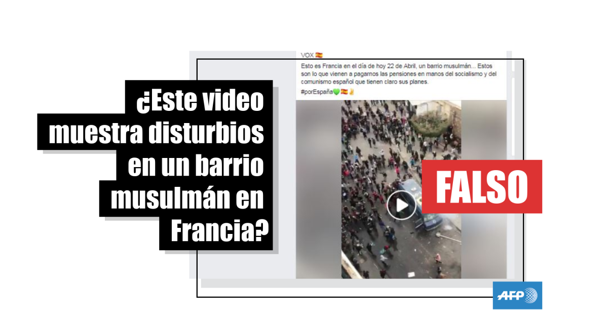 "Esto es Francia en el día de hoy 22 de Abril, un barrio musulmán... Estos son lo que vienen a pagarnos las pensiones en manos del socialismo y del comunismo español que tienen claro sus planes", dice una de las publicaciones en Facebook del 22 de abril pasado. El video también circuló en Twitter.