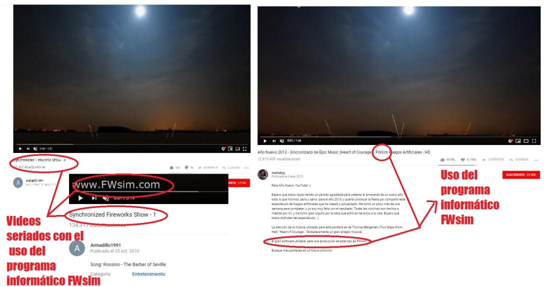 En ambos videos aparece la misma escena de fondo. Esto se explica porque los dos fueron creados con FWsim (Fireworks Simulator) –un programa de computadora con el que se generan animaciones de fuegos pirotécnicos–. Los autores de cada video afirman hacer uso del programa en sus respectivos canales de YouTube.