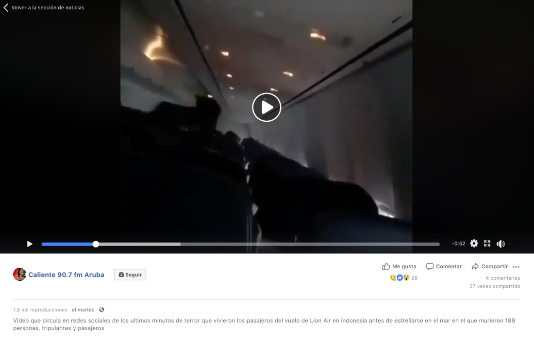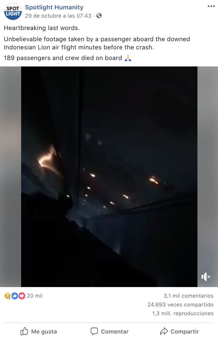 “Video que circula en redes sociales de los últimos minutos de terror que vivieron los pasajeros del vuelo de Lion Air en Indonesia antes de estrellarse en el mar en el que murieron 189 personas, tripulantes y pasajeros”, se lee en la publicación.
