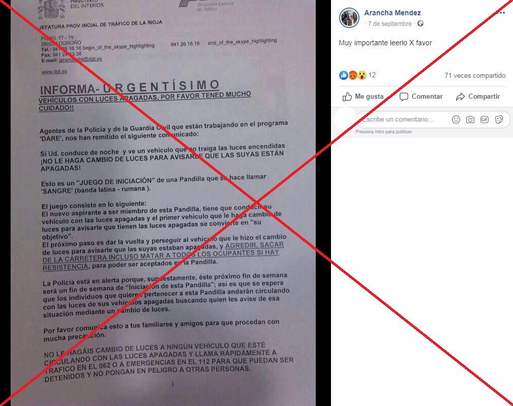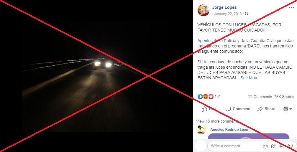 “VEHÍCULOS CON LUCES APAGADAS, POR FAVOR TENED MUCHO CUIDADO”, comienzan algunas de las entradas publicadas en Facebook, como esta de 2013 compartida en más de 75.000 ocasiones, y otras que circulan de nuevo, en ocasiones con la imagen de un supuesto comunicado policial.
