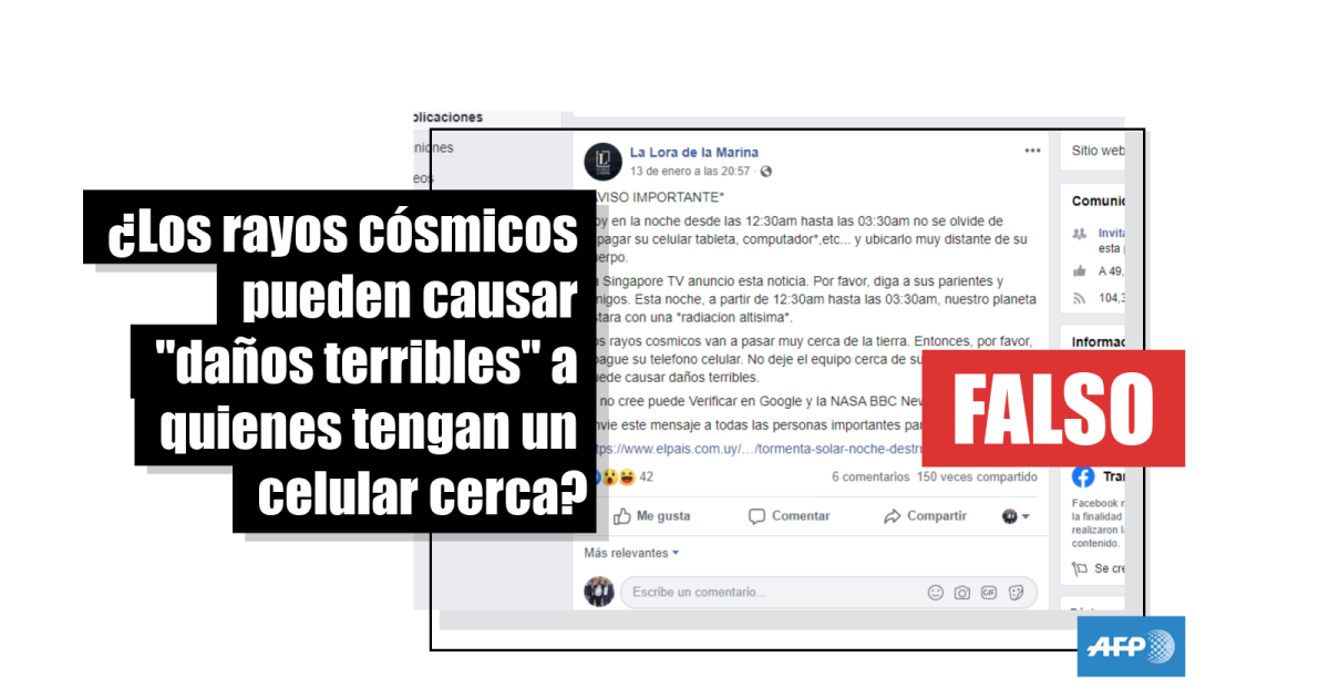 “Hoy en la noche desde las 12:30am hasta las 03:30am no se olvide de *apagar su celular tableta, computador*,etc... y ubicarlo muy distante de su cuerpo (...) Los rayos cosmicos van a pasar muy cerca de la tierra. Entonces, por favor, apague su telefono celular. No deje el equipo cerca de su cuerpo, pues le puede causar daños terribles (sic)”, dice un mensaje que circula en redes sociales y llegó a la redacción de AFP Factual vía WhatsApp, con la solicitud de ser verificado.