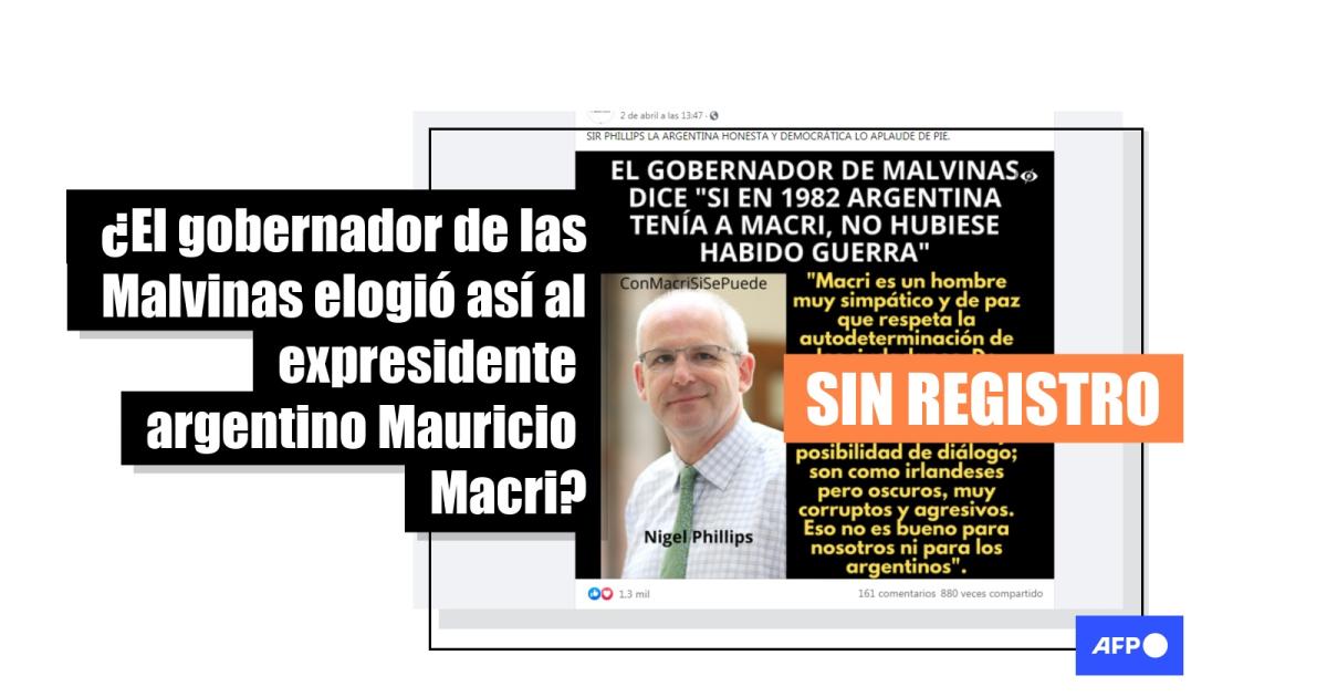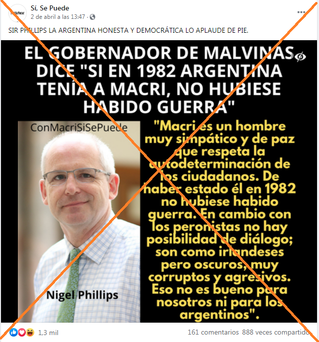 La imagen con la supuesta declaración circula en Facebook (1, 2) desde el 2 de abril pasado, fecha en que en Argentina se conmemora el aniversario de la Guerra de Malvinas. “El gobernador de Malvinas dice ‘si en 1982 Argentina tenía a Macri, no hubiese habido guerra'”, comienza el texto que acompaña una fotografía del gobernador de las Islas, Nigel Phillips, tomada del sitio web oficial del gobierno británico.