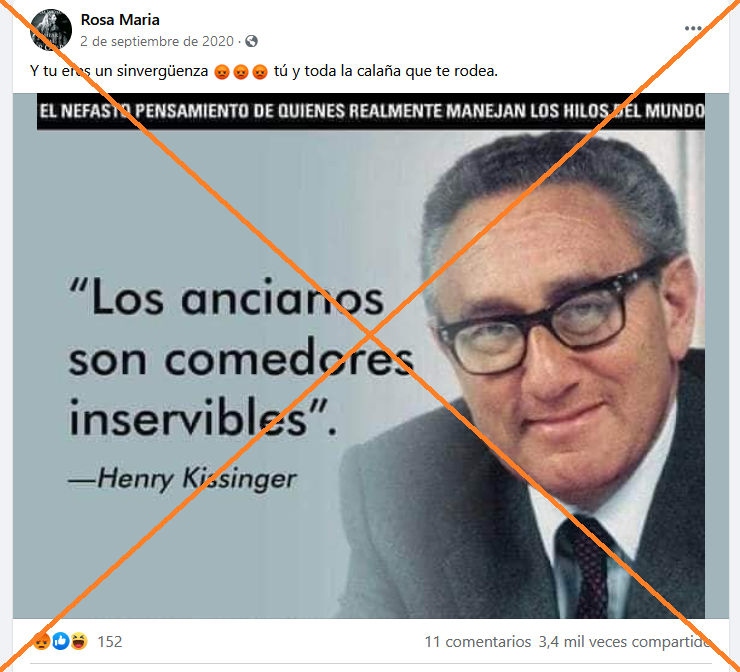 “El nefasto pensamiento de quienes manejan los hilos del mundo”, se lee en un meme que muestra una fotografía de Henry Kissinger junto con la cita: “Los ancianos son comedores inservibles” (1, 2, 3).