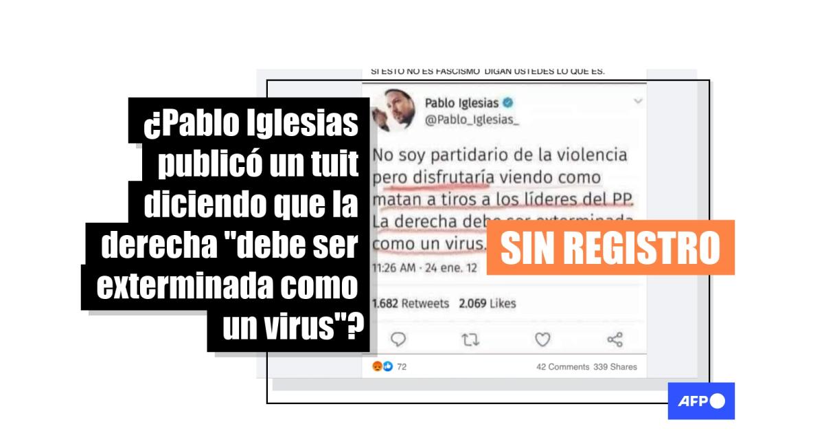 “No soy partidario de la violencia pero disfrutaría viendo como matan a tiros a los líderes del PP. La derecha debe ser exterminada como un virus”, dice el tuit completo con fecha del 24 de enero de 2012, que se atribuye al actual candidato de Unidas Podemos a la presidencia regional de Madrid, Pablo Iglesias. El primer registro encontrado por AFP Factual de la captura de pantalla del tuit es de 2018 y fue muy compartido tanto en 2019 como en 2020.