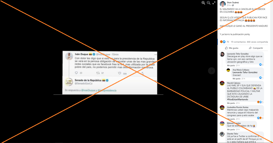 “Con dolor les digo que si esto no para la presidencia de la Republica se vera en la penosa obligacion de cancelar unas de las mas grandes redes sociales que es facebook free la red mas utilizada por la clase pobre del pais, no podemos permitir mas desinformación mentirosa”, dice el presunto tuit, que contiene varias faltas de ortografía y que circula en Facebook (1, 2).
