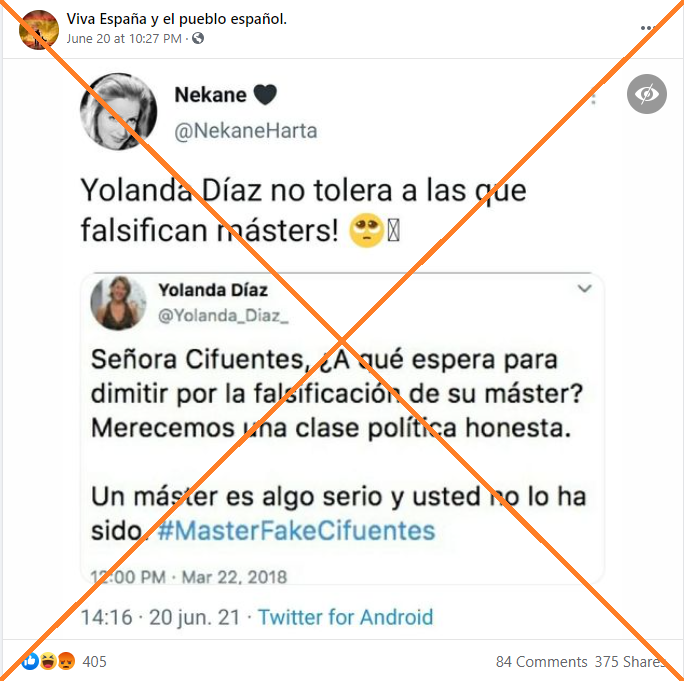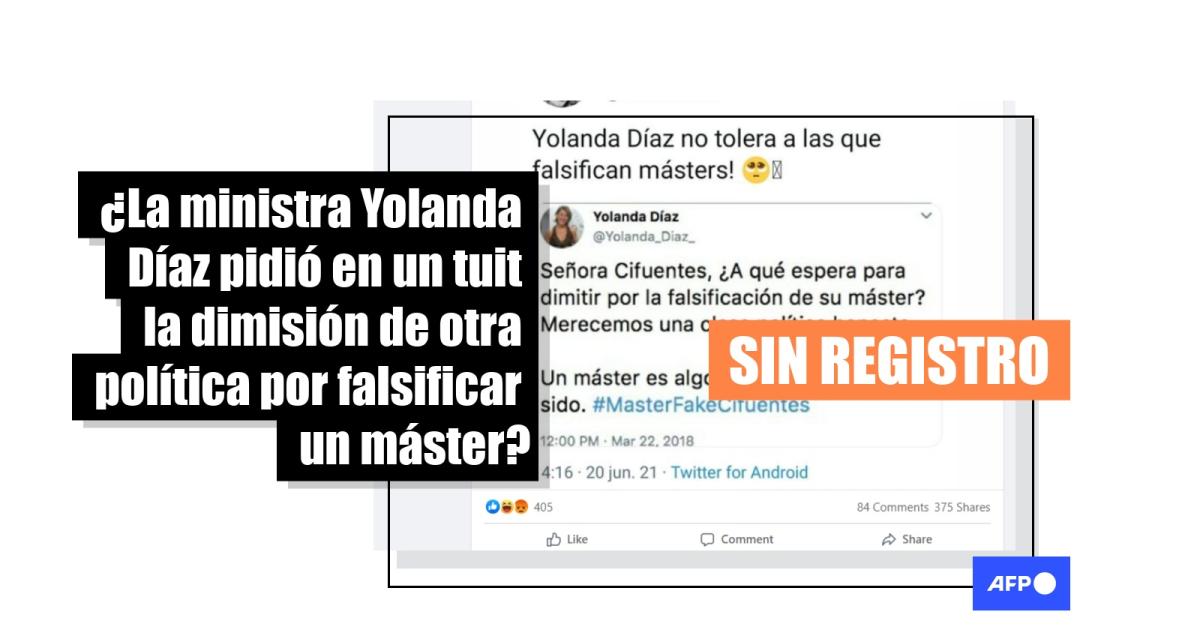 No hay registro de un tuit de la ministra española Yolanda Díaz por el máster de Cristina Cifuentes