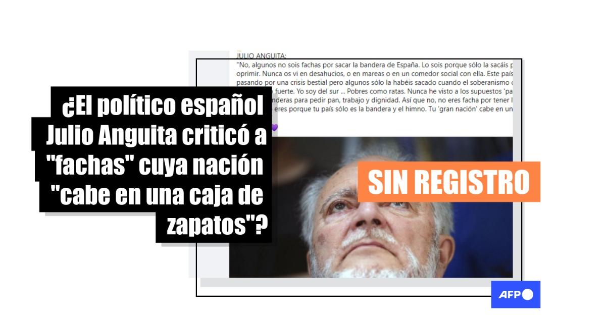 AFP Factual no encontró registro de la cita, ni de una similar, en declaraciones públicas de Anguita tras una búsqueda por varias palabras clave de la declaración (“facha”, “desahucios”, “comedor social”, “caja de zapatos”), pero sí llegó a una página de Facebook llamada “Seguidores de Julio Anguita”, que el 6 de octubre de 2017 difundió la declaración, aunque firmada por PabloMM. Un día después, el usuario PabloMM subió a Facebook la declaración que se le adjudica a Anguita.