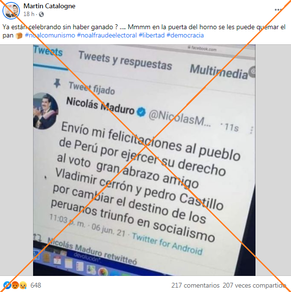 Este contenido se ha difundido tras el balotaje presidencial en Perú entre Pedro Castillo (Perú Libre) y Keiko Fujimori (Fuerza Popular).