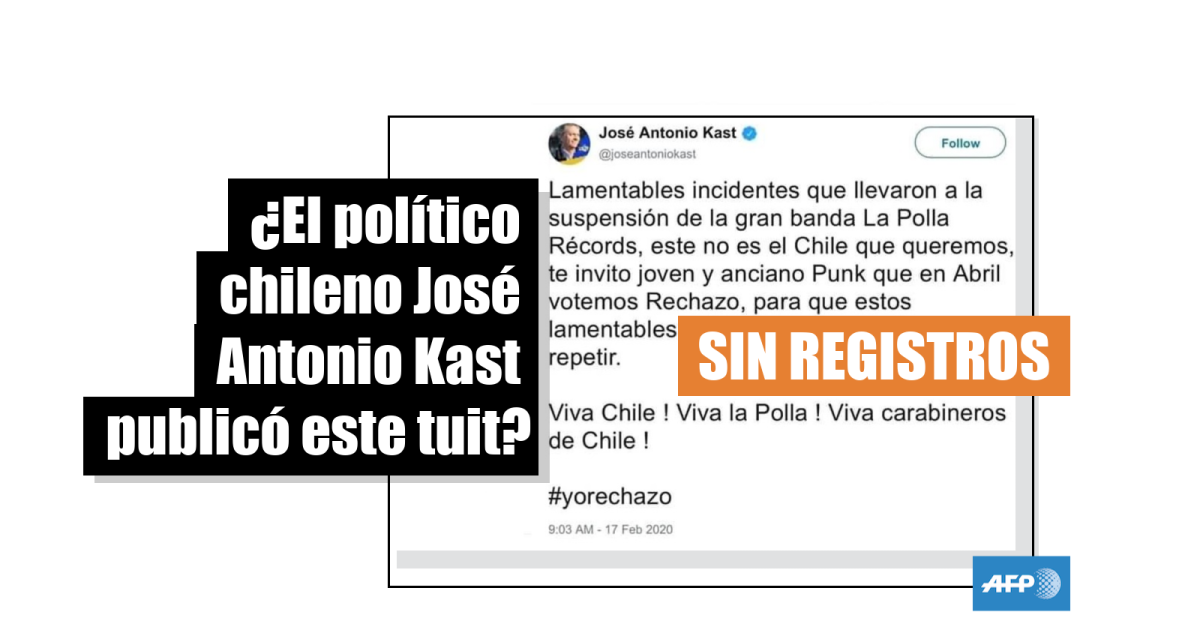 No hay registros de que el excandidato presidencial Kast haya tuiteado sobre un concierto de La Polla Records en Chile