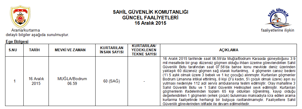 Según un comunicado de la Guardia Costera de Turquía fechado el 16 de diciembre de 2015 (ver abajo), ésta fue advertida a las 06h59 de la presencia en el mar de un grupo de migrantes a 3.9 millas náuticas (7.2 km) al sureste de la isla de Karaada, frente a Bodrum. El comunicado no especifica si el barco estaba en dificultades.