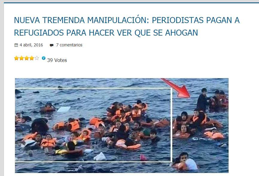 “Nueva tremenda manipulación: periodistas pagan a refugiados para hacer ver que se ahogan”, titula una nota que ha sido retomada por diversos portales y blogs en internet y ampliamente compartida en Facebook.