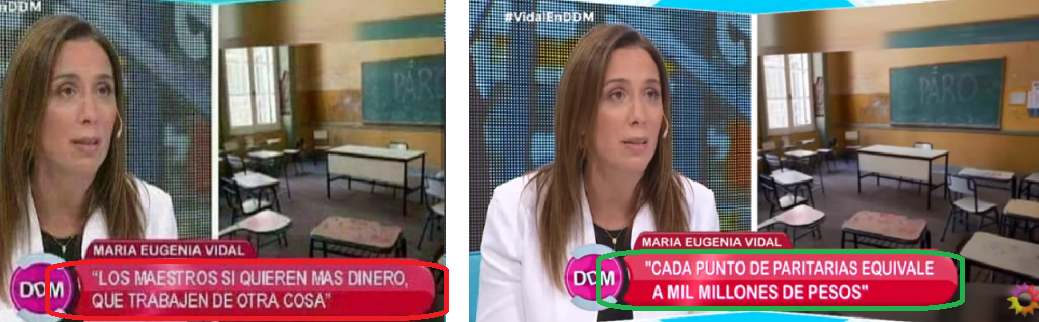 Según las publicaciones, en una entrevista televisiva en el programa “El diario de Mariana”, Vidal habría dicho: “Los maestros, si quieren más dinero, que trabajen de otra cosa”. En la misma imagen se puede ver una pantalla partida donde, de un lado, aparece la mandataria bonaerense y, del otro, un aula con mesas y sillas vacías y la palabra “Paro” en un pizarrón verde.
