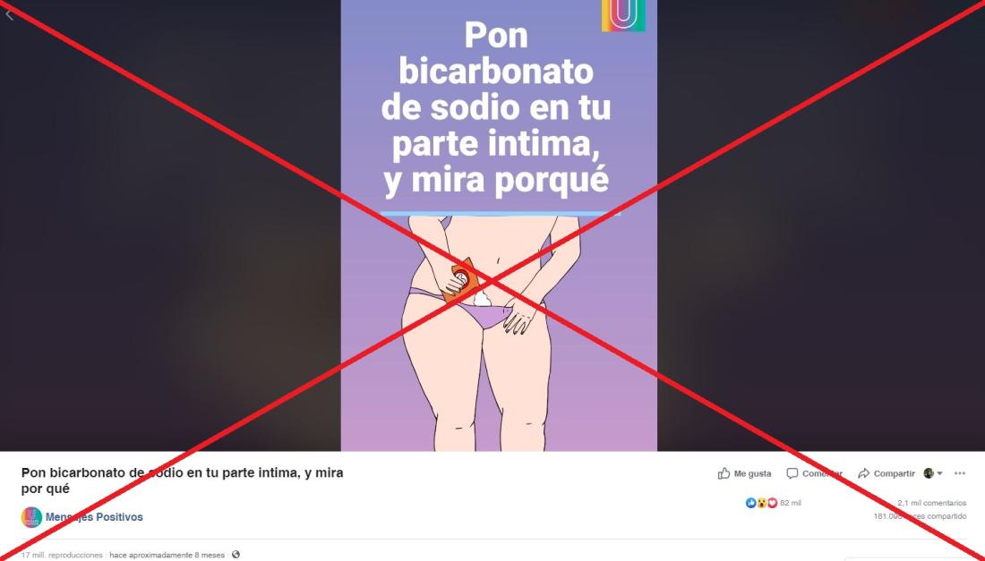 Según el video, que ha sido visto por 17 millones de usuarios de Facebook, el bicarbonato de sodio puede ser usado para tratar la candidiasis ya que “ayuda a restaurar el equilibrio del PH y llevarlo al nivel óptimo”.