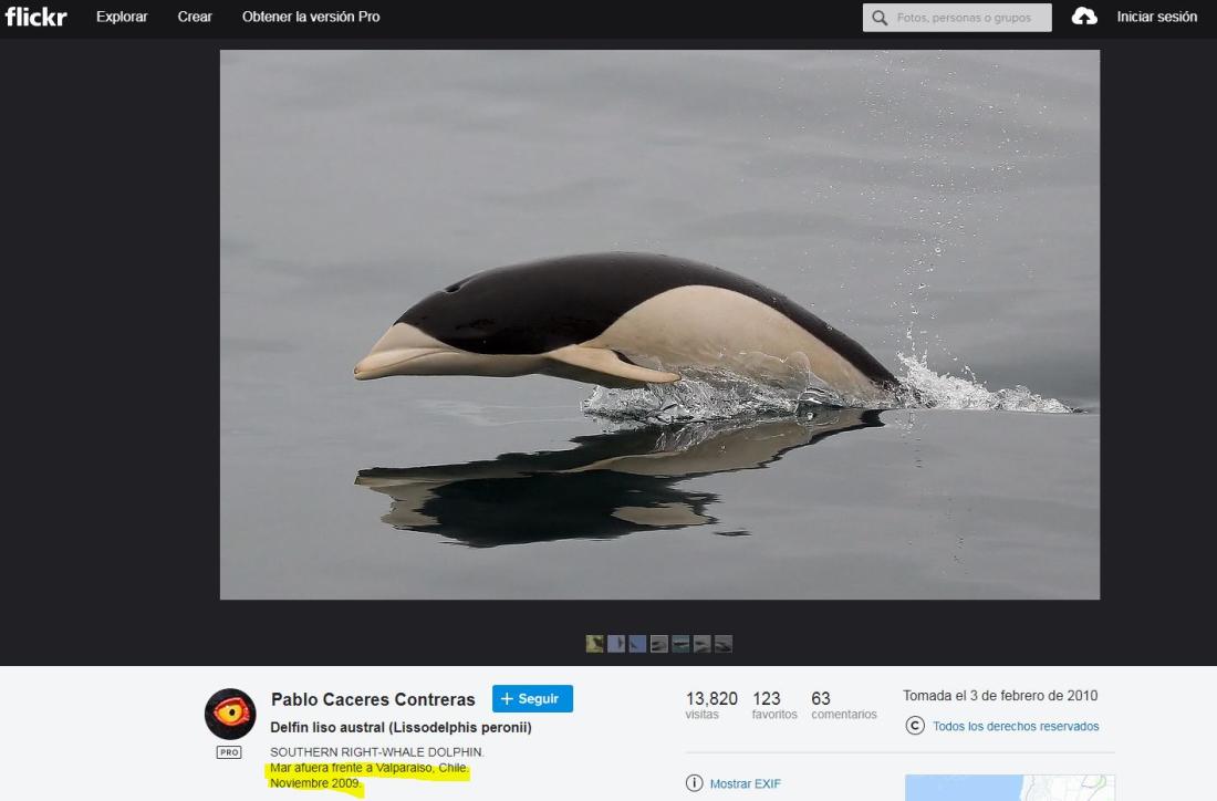 Como resultado de una búsqueda inversa* de ambas imágenes se encontraron diversas fotografías y videos del delfín liso tomados antes de junio de 2019. Tanto el Centro de Conservación Cetácea como el Ministerio de Medio Ambiente chilenos indican que este tipo de delfín se encuentra sobre todo en aguas frías del océano abierto del sur y también del norte, y que raramente se acerca a la zona costera.