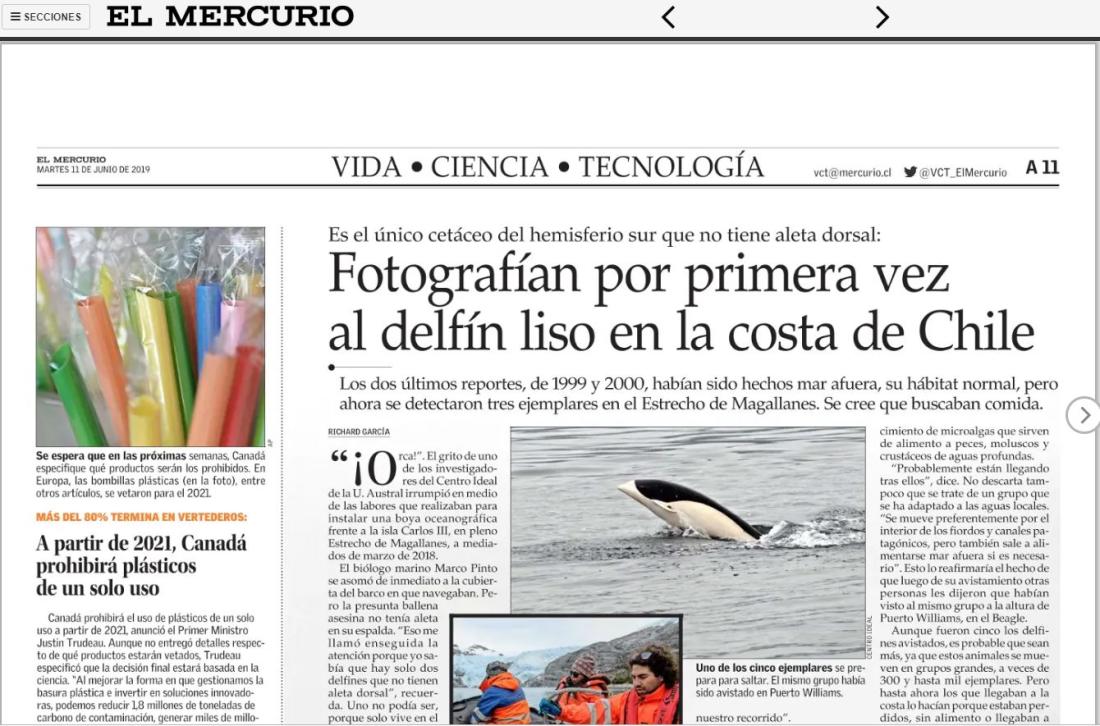 En el artículo, Pinto afirma que sus fotografías son el primer registro gráfico de la presencia del delfín liso en el Estrecho de Magallanes.