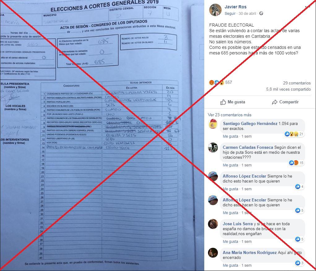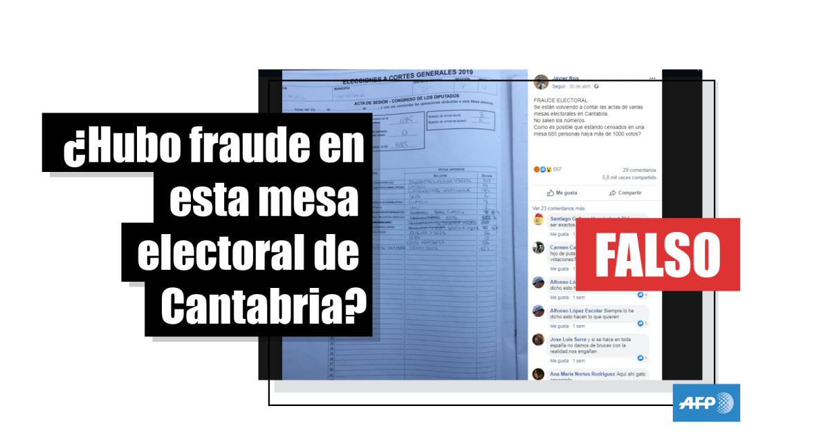 “FRAUDE ELECTORAL Se están volviendo a contar las actas de varias mesas electorales en Cantabria. No salen los números. Como es posible que estando censados en una mesa 685 personas haya más de 1000 votos?”: este párrafo y una fotografía del acta electoral, donde la suma de los votos es de 1.099, cuando los electores censados son 685, circulan al menos desde el 30 de abril, poniendo en duda el resultado global de las elecciones legislativas, que ganó el PSOE.