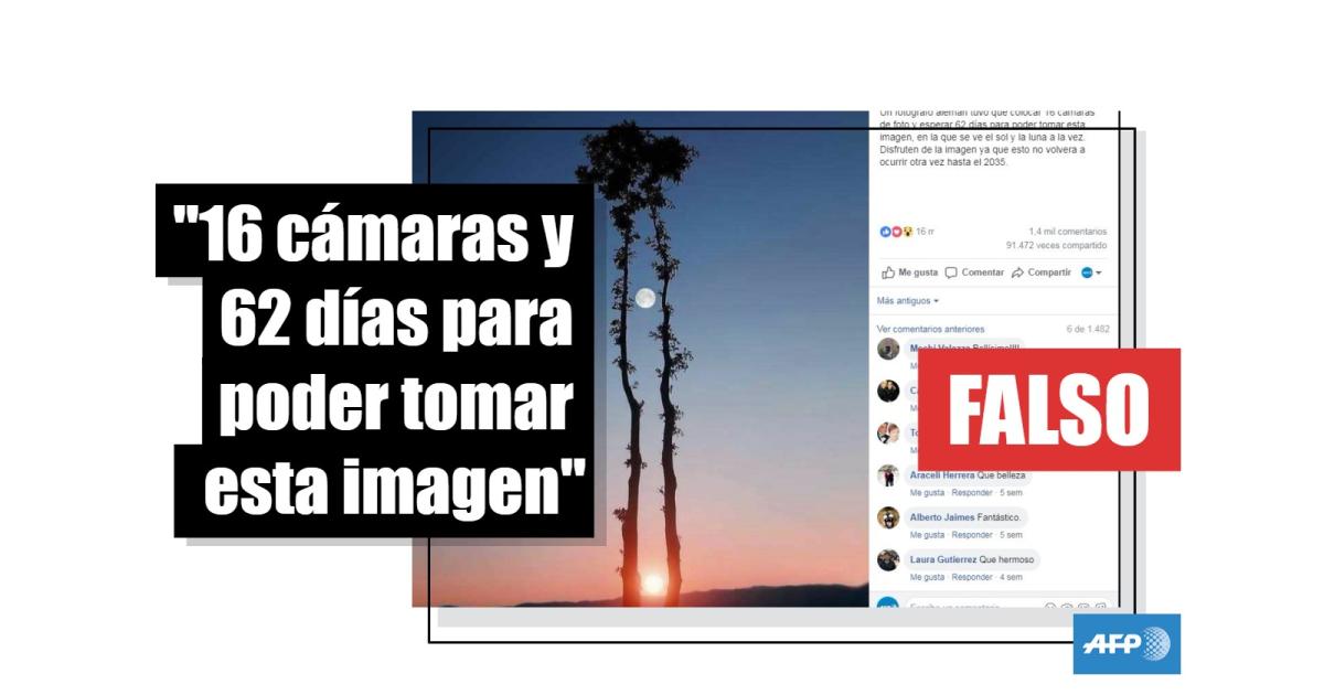 Esta publicación en Facebook, compartida más de un millón de veces en una versión similar en inglés, tiene como leyenda: “16 cámaras y 62 días para obtener está foto del Sol y la Luna (sic)”.