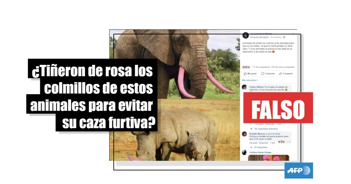 "Activistas les pintan los cuernos a los animales para que no los maten. Ya que el marfil pintado no tiene valor. Y a los animales la pintura no les daña en la salud pero si les salva la vida", reza la leyenda de una de las publicaciones compartida más de 100.000 veces. Una segunda publicación, más de 90.000 veces compartida, tiene una leyenda prácticamente igual.