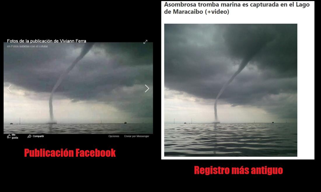3.- El tornado sobre el agua Esta imagen se ha utilizado en distintos años y diferentes sitios para ilustrar una tromba o manga marina –torbellino delgado sobre el agua.El registro más antiguo de la imagen es del 24 de mayo de 2014, de acuerdo con el artículo, el fenómeno sucedió en Maracaibo, Venezuela. |
