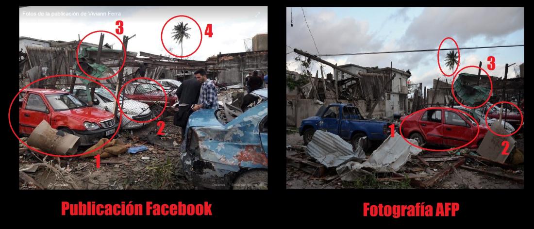 El joven y el carro rojo El fotógrafo de la AFP en La Habana Yamil Lage tomó una imagen, el 28 de enero, en el mismo sitio pero desde diferente ángulo. Las fotos coinciden en: 1.- El auto rojo. 2.- Dos autos más a su costado. 3.- El techo verde destruido. 4.- La palmera. |