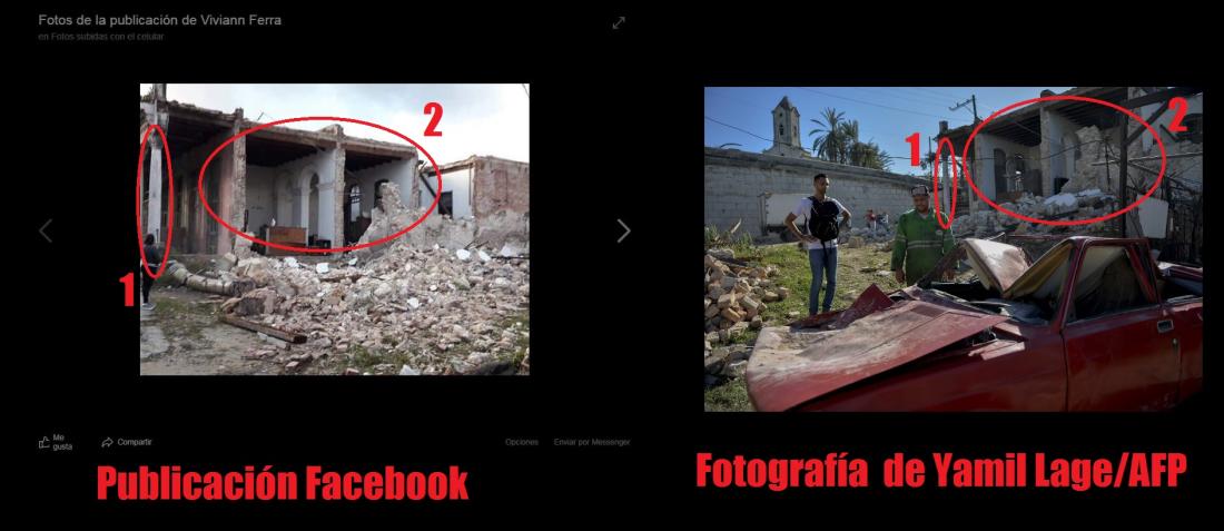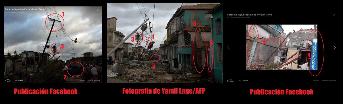 El poste oscuro y "transformers" El fotógrafo de la AFP realizó una toma en el mismo sitio donde dos de las imágenes compartidas en Facebook fueron capturadas. En ninguna de las tres el ángulo es el mismo, pero cuentan con algunas coincidencias que enumeramos a continuación: 1.- Poste que está por caerse. 2.- Carro azul. 3.- Palmera. 4.- Letrero perpendicular de "transformers" en una pared azul. 5.- El poste de ladrillos que está quebrado. |