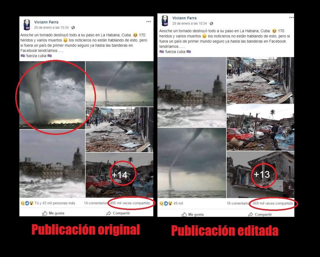 “Anoche un tornado destruyó todo a su paso en La Habana, Cuba. 170 heridos y varios muertos, los noticieros no están hablando de esto, pero si fuera un país de primer mundo seguro hasta las banderas en Facebook tendríamos… fuerza cuba”, dice una publicación del 28 de enero, un día después de que un tornado con velocidad de giro de hasta 322 km/h golpeara el norte de la capital.