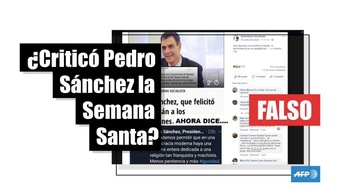 Un montaje con la fotografía de Pedro Sánchez y dos tuits, uno en el que felicitaba el Eid el Fitr musulmán y otro en el que supuestamente criticaba la Semana Santa católica, se difundió con la frase “que hacemos con el enfermo mental,, lo enchironamos en un psiquiátrico” (sic). La entrada, compartida 1.800 veces, tiene más de 300 reacciones y cerca de 200 comentarios.