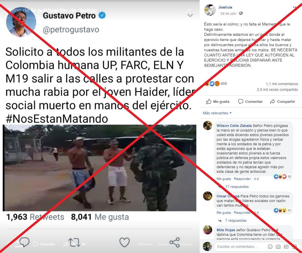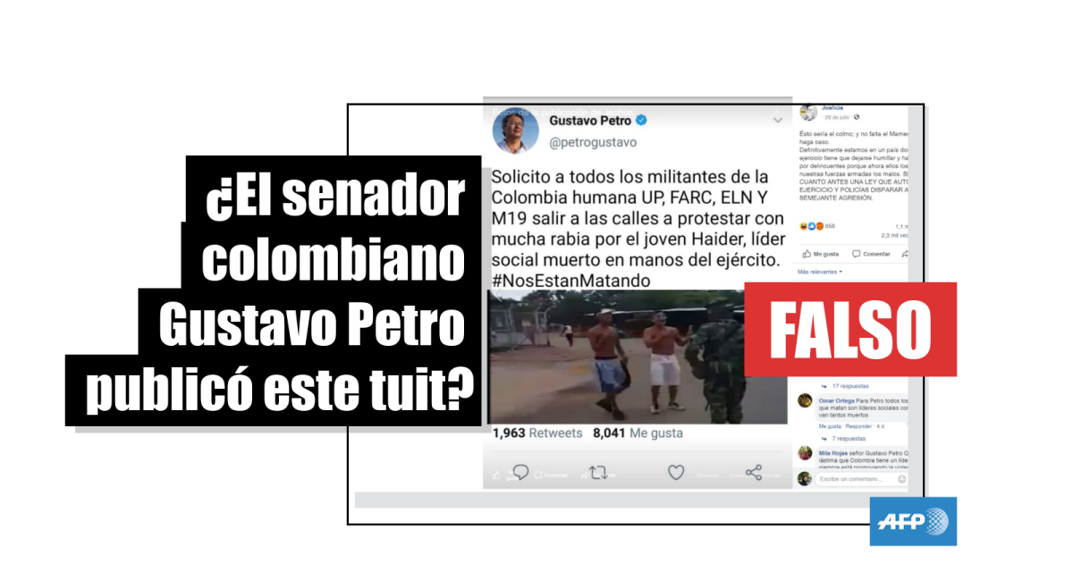 En el supuesto tuit, el excandidato presidencial afirma: “Solicito a todos los militantes de la Colombia humana UP, FARC, ELN Y M19 salir a las calles a protestar con mucha rabia por el joven Haider, líder social muerto en manos del ejército”.