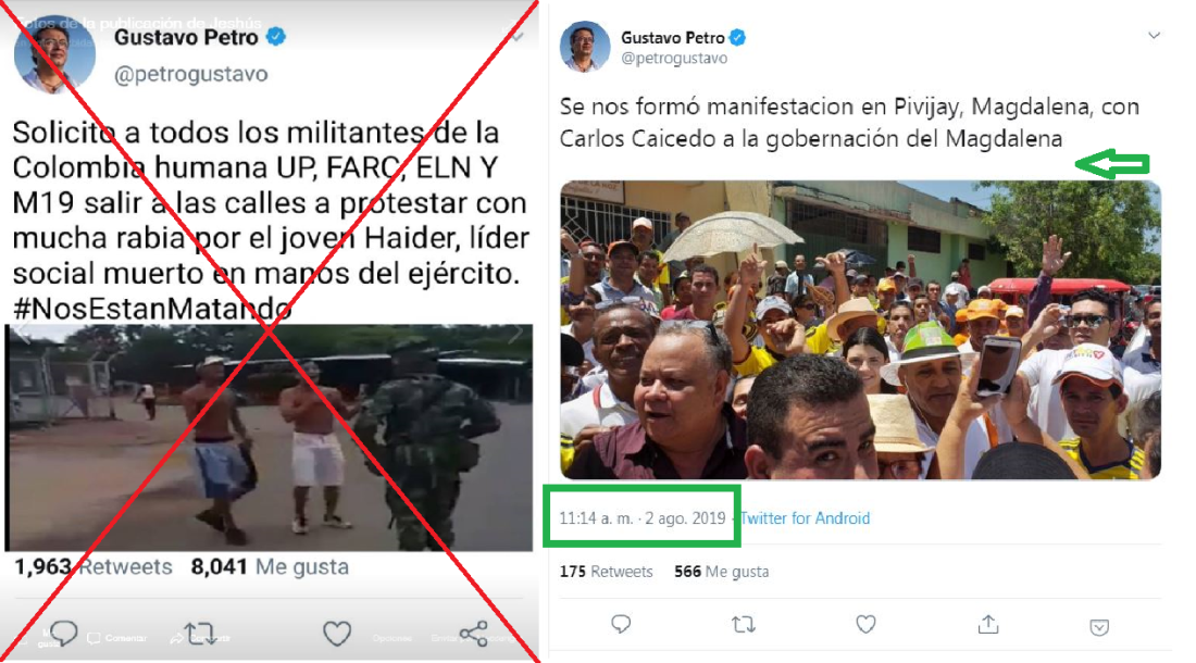 Al comparar la captura viral con un tuit real realizado desde la cuenta de Petro se puede apreciar que la imagen viralizada no tiene fecha. Además, el espaciado entre el texto y la imagen tampoco coincide con el formato que usa Twitter en sus publicaciones.
