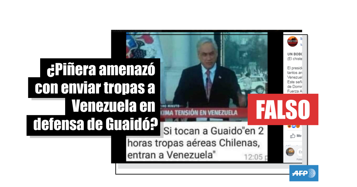 Desde el 30 de abril pasado circula en redes sociales una foto del presidente chileno, Sebastián Piñera, con el texto de una declaración que se le adjudica: “Si tocan a Guaidó, en dos horas tropas aéreas chilenas entran a Venezuela”. Aunque fue compartida más de 5.000 veces, la afirmación es falsa. La imagen sí es de una conferencia que brindó el mandatario en esa fecha, pero ni ese ni otro día hizo esas declaraciones.
