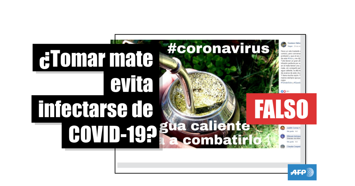 “Hace un rato trasladé a un médico (fue un viaje común), pero conversando con él me contó de su profesión y que el era de El Salvador, mucho sabía de este #virus y me dijo lo siguiente: *Uds tienen un gran aliado, EL MATE, es una infusión perfecta por su temperatura del agua, ahí en el mate tienen una gran ayuda, tomen abundante mate, sin compartir pero tomen mucho mate por el agua caliente, la alta temperatura dificulta el proceso de avance de este virus maldito me dijo. Y tiene mucha razón. Pero además lavate las manos siempre que puedas, si es cada 20 o 30 min mejor. #TomaloSolo y #QuedateEnCasa”, señala una publicación en Facebook del 20 de marzo de 2020, que incluye una foto de un mate, bebida típica de países suramericanos como Argentina y Uruguay, acompañada del texto “#coronavirus el agua caliente ayuda a combatirlo”.