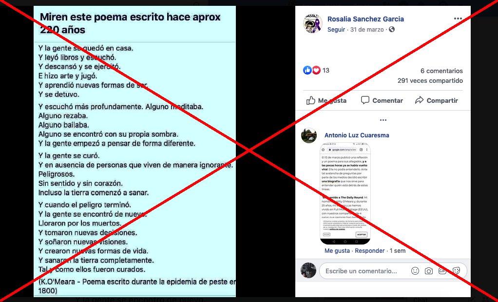 “Miren este poema escrito hace aprox 220 años [sic] ”, dice el encabezado de una publicación en Facebook que acompaña a un poema de cuatro estrofas con una reflexión sobre el aislamiento debido a la pandemia del nuevo coronavirus. Al final de la última estrofa se afirma que las líneas fueron escritas “durante la epidemia de peste en 1800” por K. O’Meara.